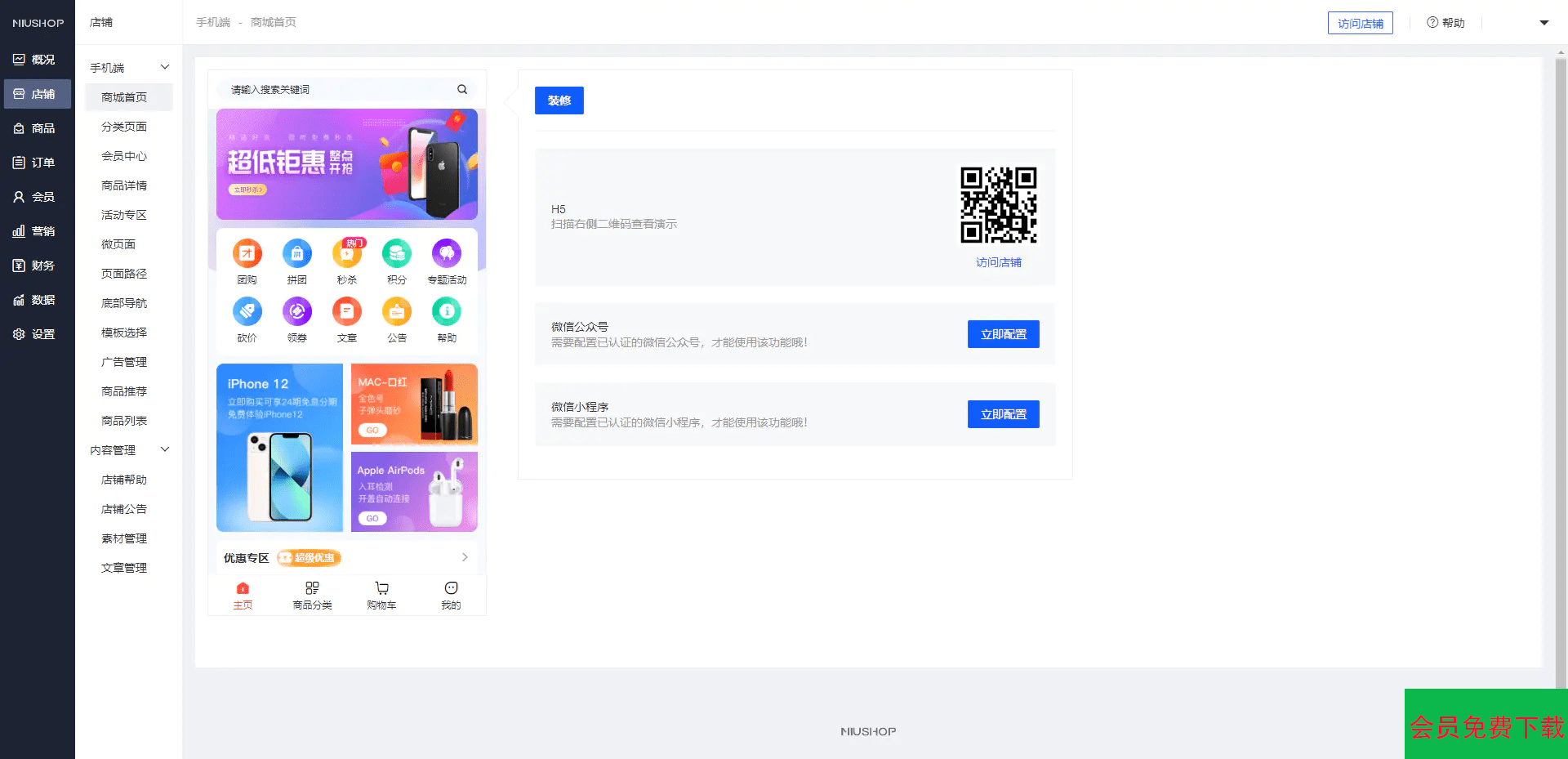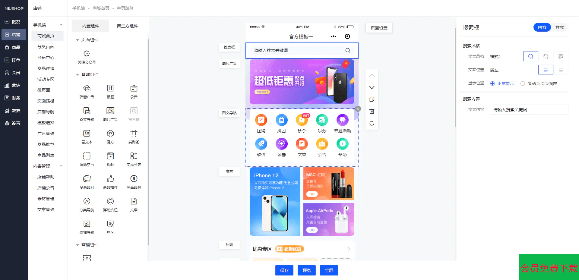 后台可以自由拖曳修改前端UI页面 还支持虚拟商品自动发货等功能 挺不错的一套源码