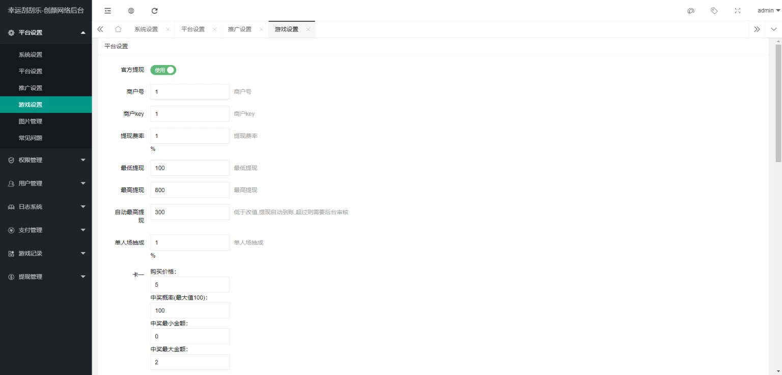 总共可以设置六种面值金额刮刮乐,可以设置中奖概率,支持设置中奖最小金额和最大金额区值