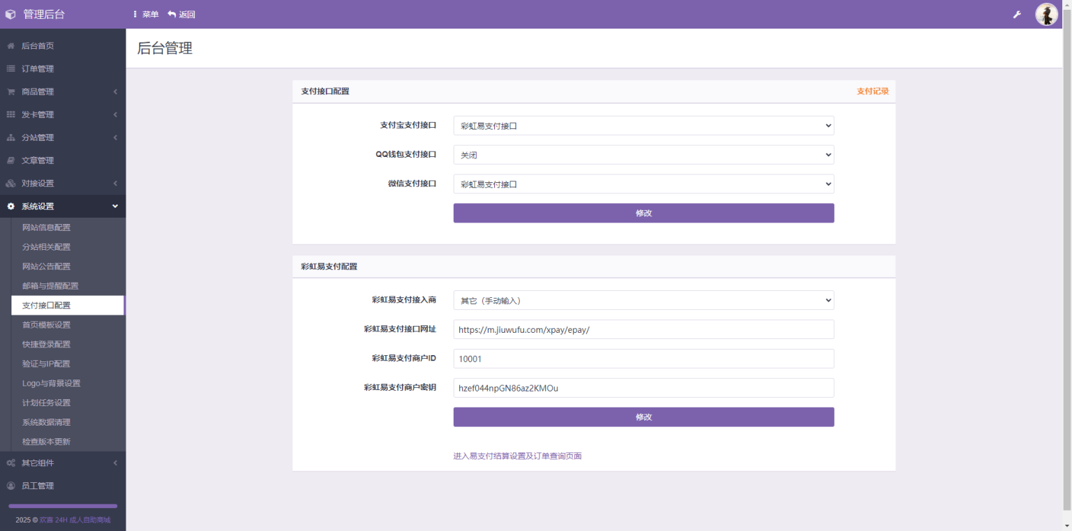 这套源码用的彩虹发卡程序,功能还是挺多的,支持开通分站,下单邮箱提醒,后台有 20 套前台模板,也可以改做其他站点 测试环境:PHP7.4,Mysql5.7 支付对接的是微信/支付宝官方支付,也可以对接第三方易/码支付,框架用的是thinkphp 搭建环境:nginx1.24.0 ·1、源码解压至根目录 ·2、配置伪静态think PHP 3.修改config.php数据库信息 ·4.导入数据库文件 5.后台:域名/admin 账号:admin 密码:123456