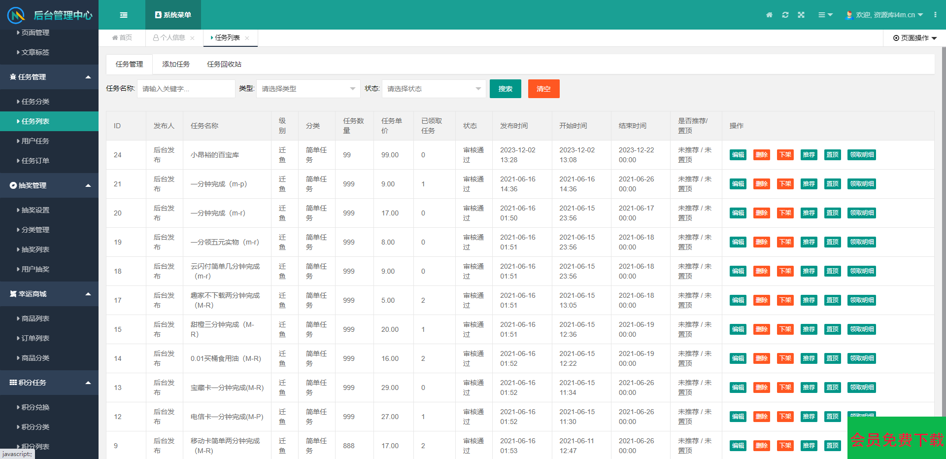任务管理:包含平台的任务列表和用户任务列表,以及任务订单的相关管理。