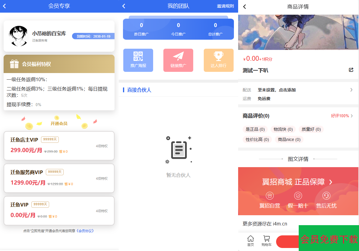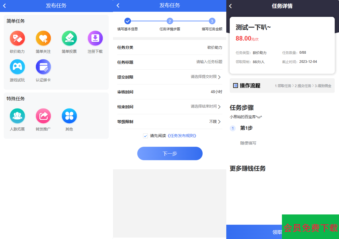 会员功能:会员可以根据不同的等级设置任务返佣比例,以及提现手续费和发布任务置顶次数的赠送问题。会员做任务的价格与普通用户做任务的返佣不同。