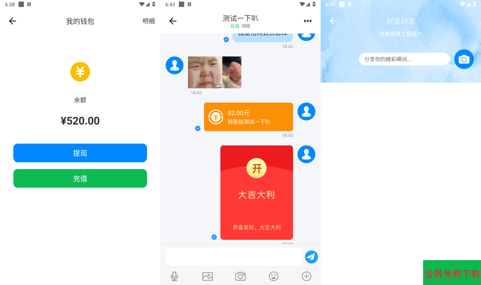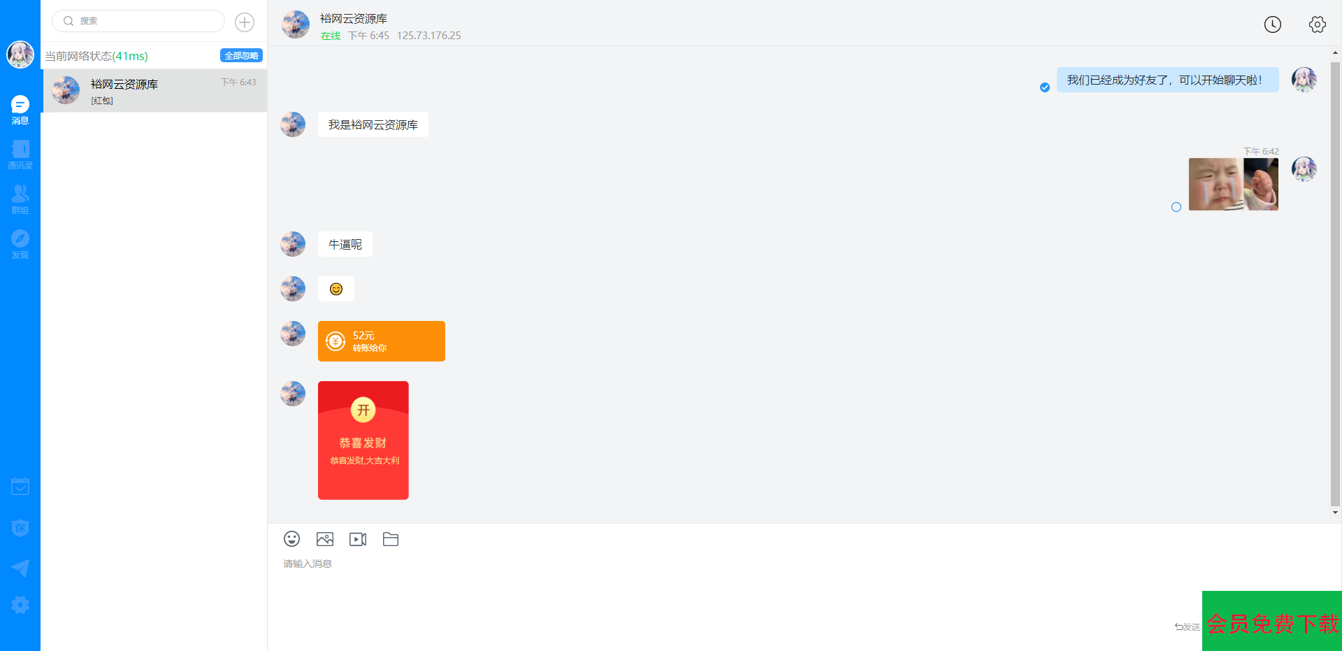 群聊:轻松实现群组聊天,支持单人禁言、全员禁言、群红包、@TA、设置管理员、踢群成员、禁止退群等灵活的成员和权限管理,同时支持大群的消息历史记录漫游和进一步提升。