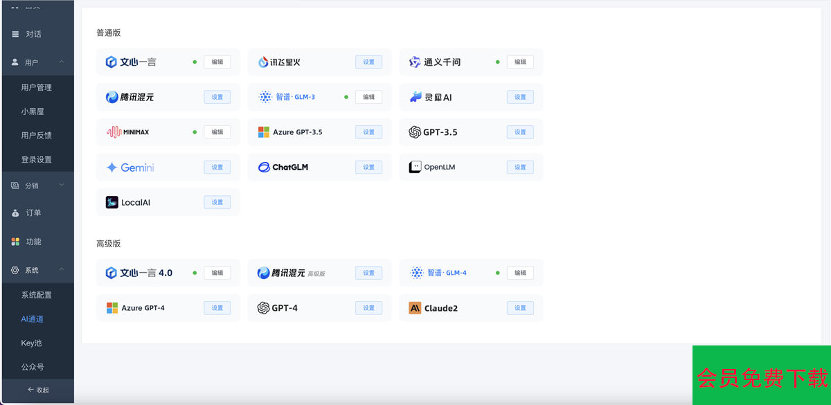 ai通道:文心一言、MiniMax、智谱AI、通义千问、GPT-3.5、Azure GPT-3.5、Gemini、讯飞星火、腾讯混元、灵犀AI、ChatGLM、OpenLLM,GPT-3.5、Gemini是国外接口哦~
