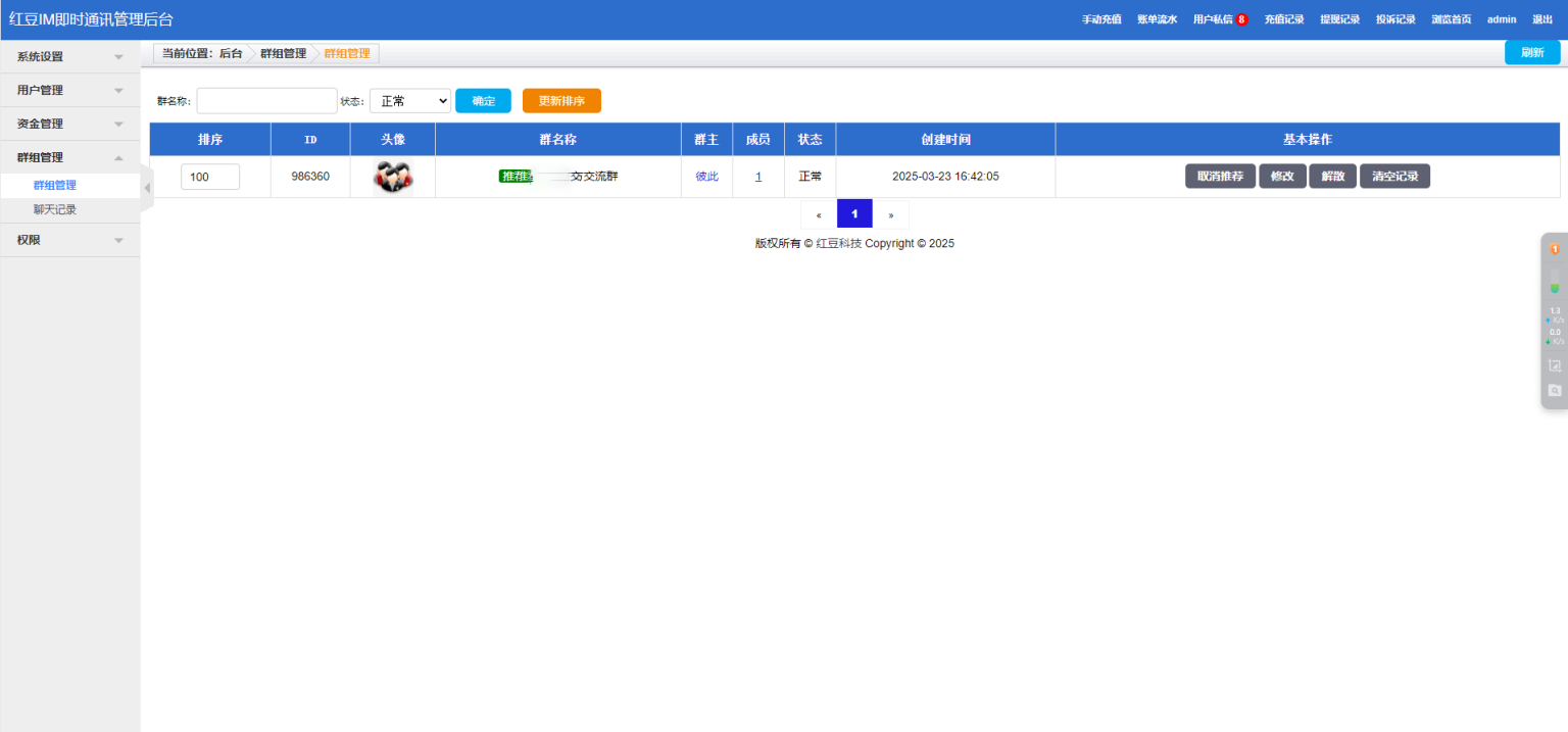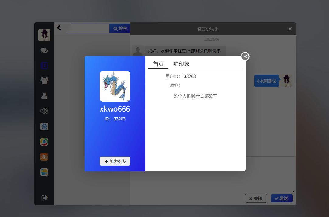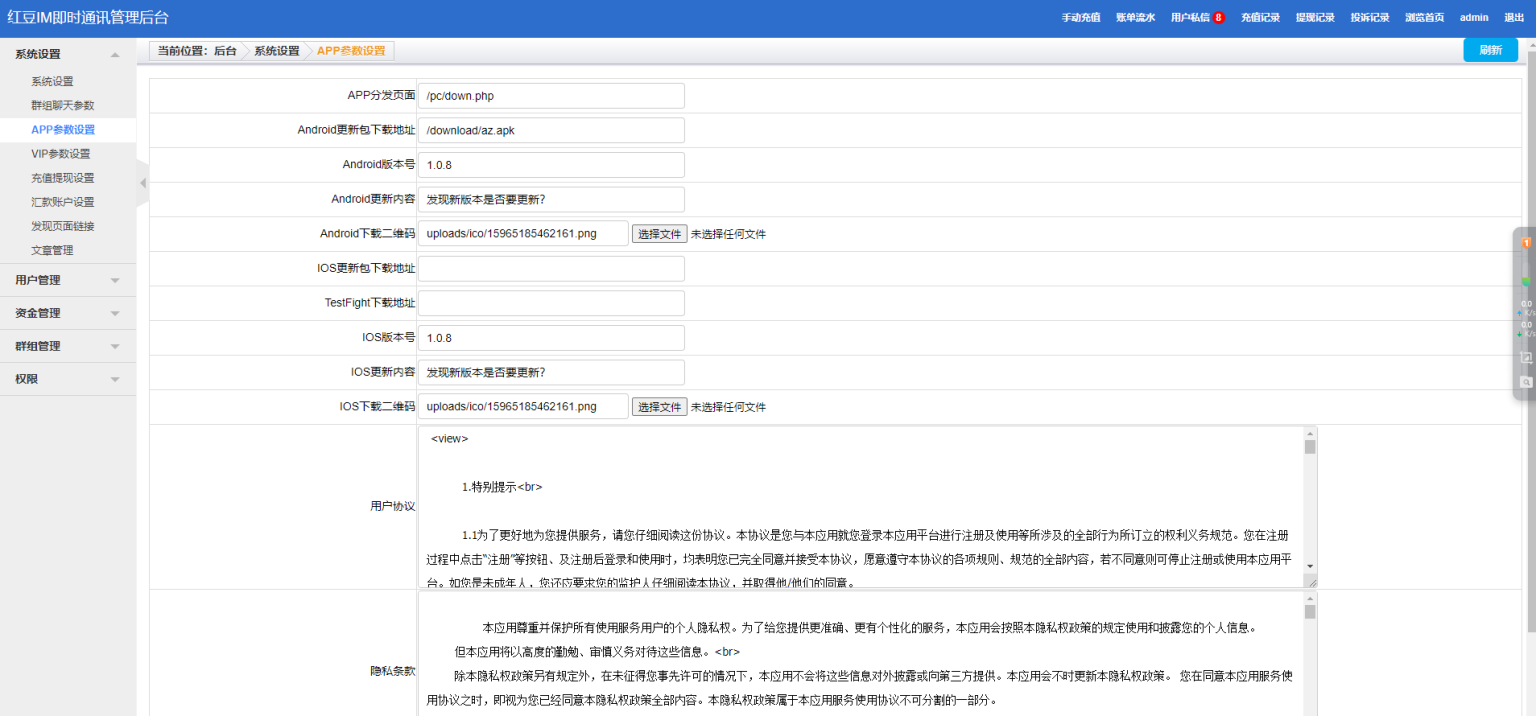 功能介绍支持文字、表情、图片、语音、单聊、群聊、已读未读、红包、转账、消息群发内嵌外链、签到、敏感词、邀请码、密保等完备的IM功能。单聊:快速实现私信单聊,具备图片、语音、动态表情、小视频、红包、通话等